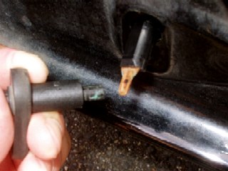 写真の赤丸のところがルームランプのスイッチです。ドアが開いた状態では突起の部分が出っ張り、スイッチ「ON」の状態であり、ドアを閉めると突起がドアによりへこんでスイッチが「OFF」の状態になります。この「ON」の状態の時に通電するはずの金属部分が腐食等により電気を通しにくくなる時、ランプがうまくつかない症状につながります。