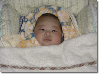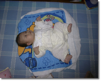 退院の時はすっぽりくるんで、尚余りがあったおくるみが、最近ではちょっとはみだしてしまいます。大きくなったなぁ・・・と実感します。(*^_^*) |